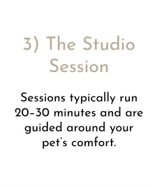 Sessions usually take around 60 minutes (minimum) and are tailored to your pet's comfort. Afterward, you'll enjoy a relaxed image reveal experience where you select your artwork.